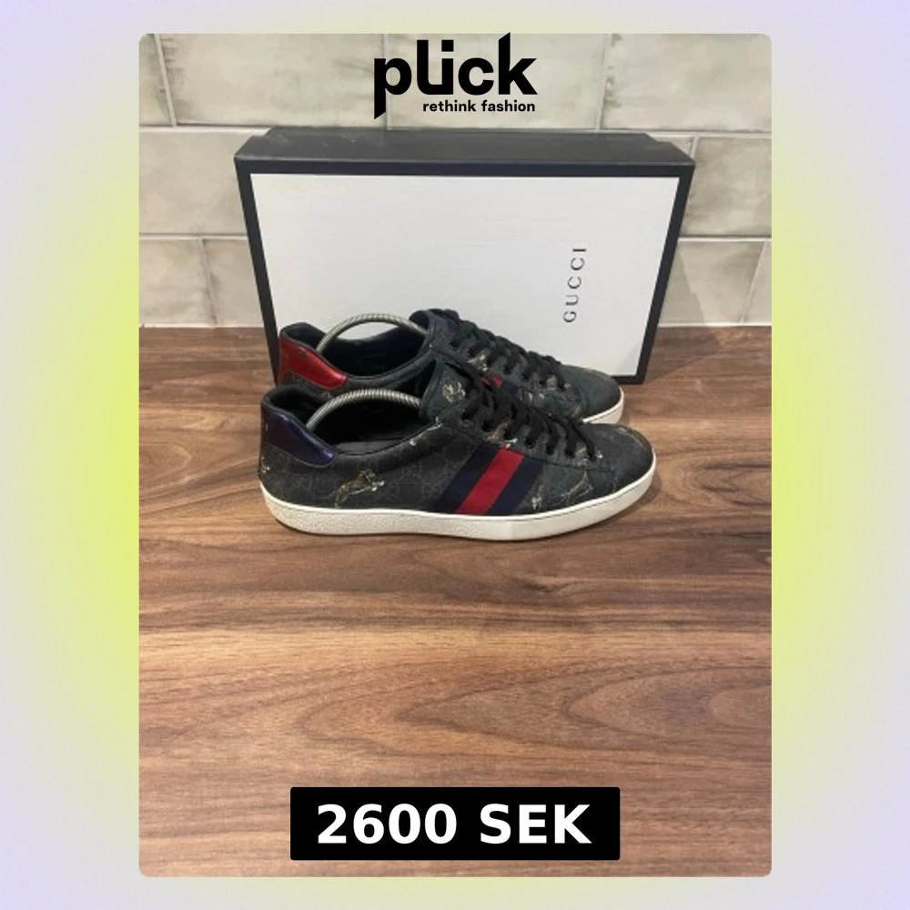 Gucci sneakers i svart med klassiskt monogrammönster och guldfärgade detaljer. Sidan har en röd och blå rand, och hälen är dekorerad med metallicrött och blått. Vit sula och svarta skosnören. Snygg och exklusiv design som sticker ut.