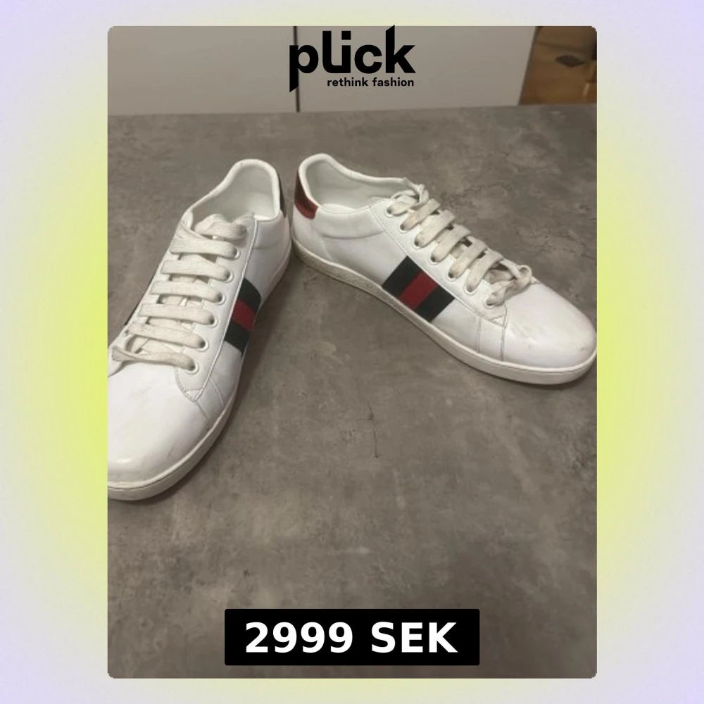 Säljer ett par vita Gucci Ace sneakers i läder med klassiska gröna och röda ränder på sidorna samt guldbroderad bi på ena skon. Skorna har vita snören och lågt skaft. Perfekta för dig som vill ha en clean men lyxig look.