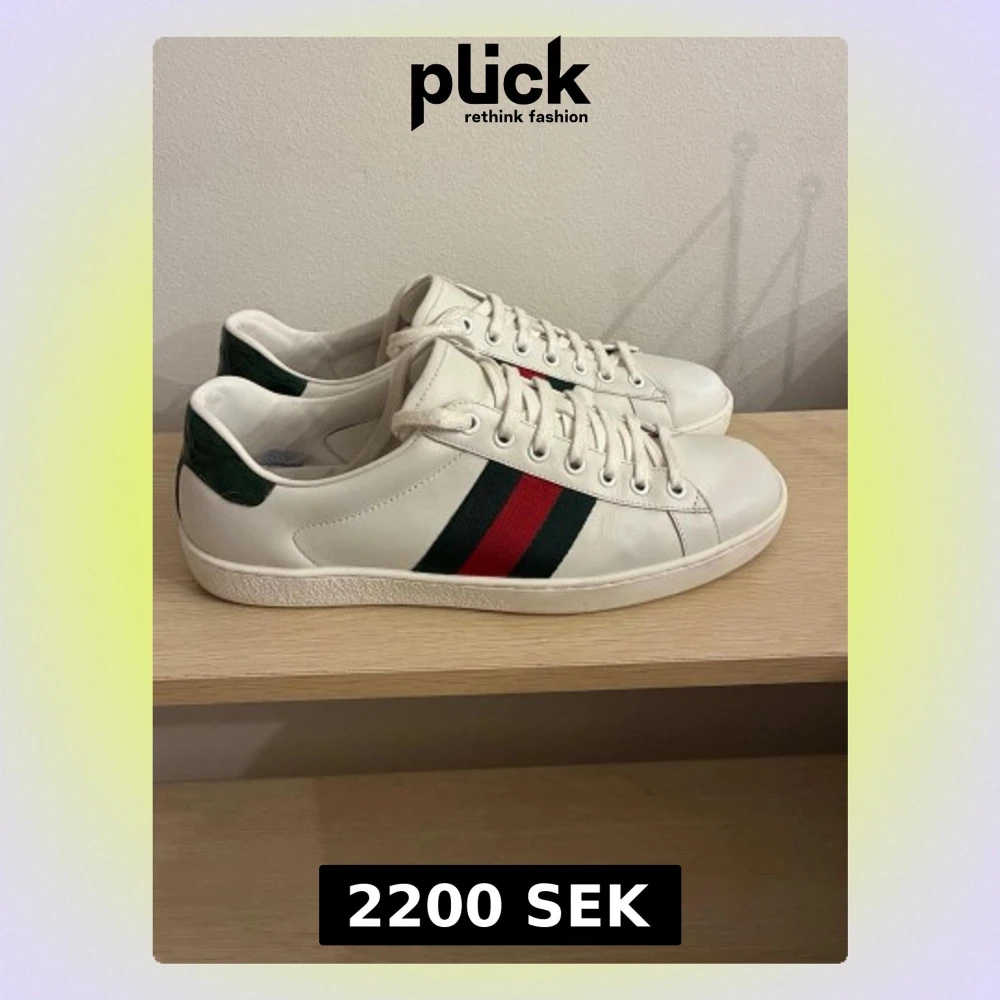Snygga vita sneakers från Gucci i läder med klassiska gröna och röda sidoremsor samt mörkgrön detalj vid hälen. Skorna har lågt skaft och vita snören. Perfekta för dig som vill ha en clean och lyxig look med ikoniska detaljer.