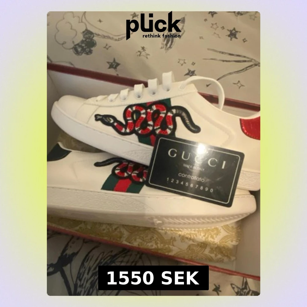 Säljer ett par vita Gucci Ace sneakers med den ikoniska broderade ormen på sidan, gröna och röda ränder samt röd metallic-detalj på hälen. Klassisk låg modell i läder med vita snören och gummisula. Perfekta för dig som vill sticka ut med lyxig streetstyle.