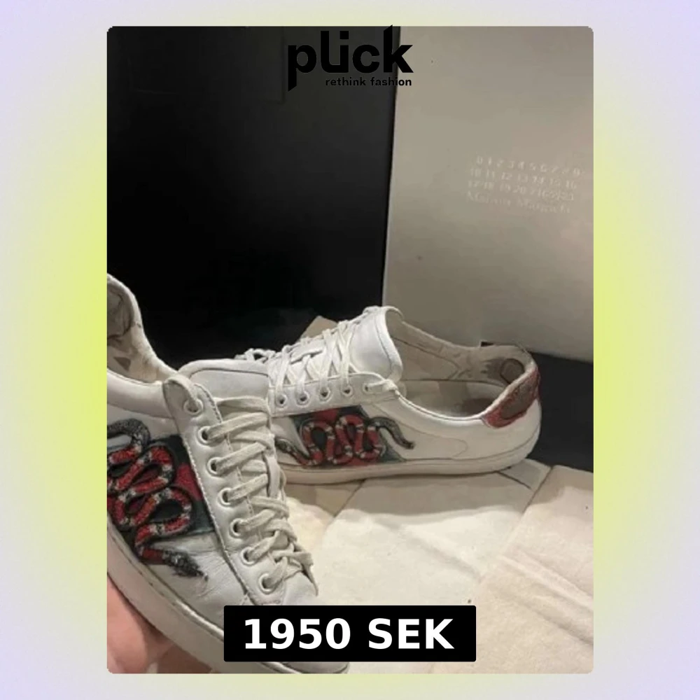 Snygga vita Gucci Ace sneakers i läder med ikonisk broderad röd och svart orm på sidan. Skorna har gröna och röda detaljer på hälen och klassisk låg siluett. Perfekta för dig som vill sticka ut med en lyxig och trendig look. Enda stora defekt är sulan under skon som är sliten, skon är även overall ganska använd