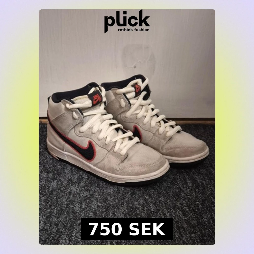 Nike SB DUNK High pro prm. Beigea höga med svart nike logga och orangea detaljer. Begiea och svarta snören fås med. Varje sko har engen unik lapp på plösen. Höger sko har en unik sula där det ser ut som man har gått i ett tuggummi. Original box fås med.