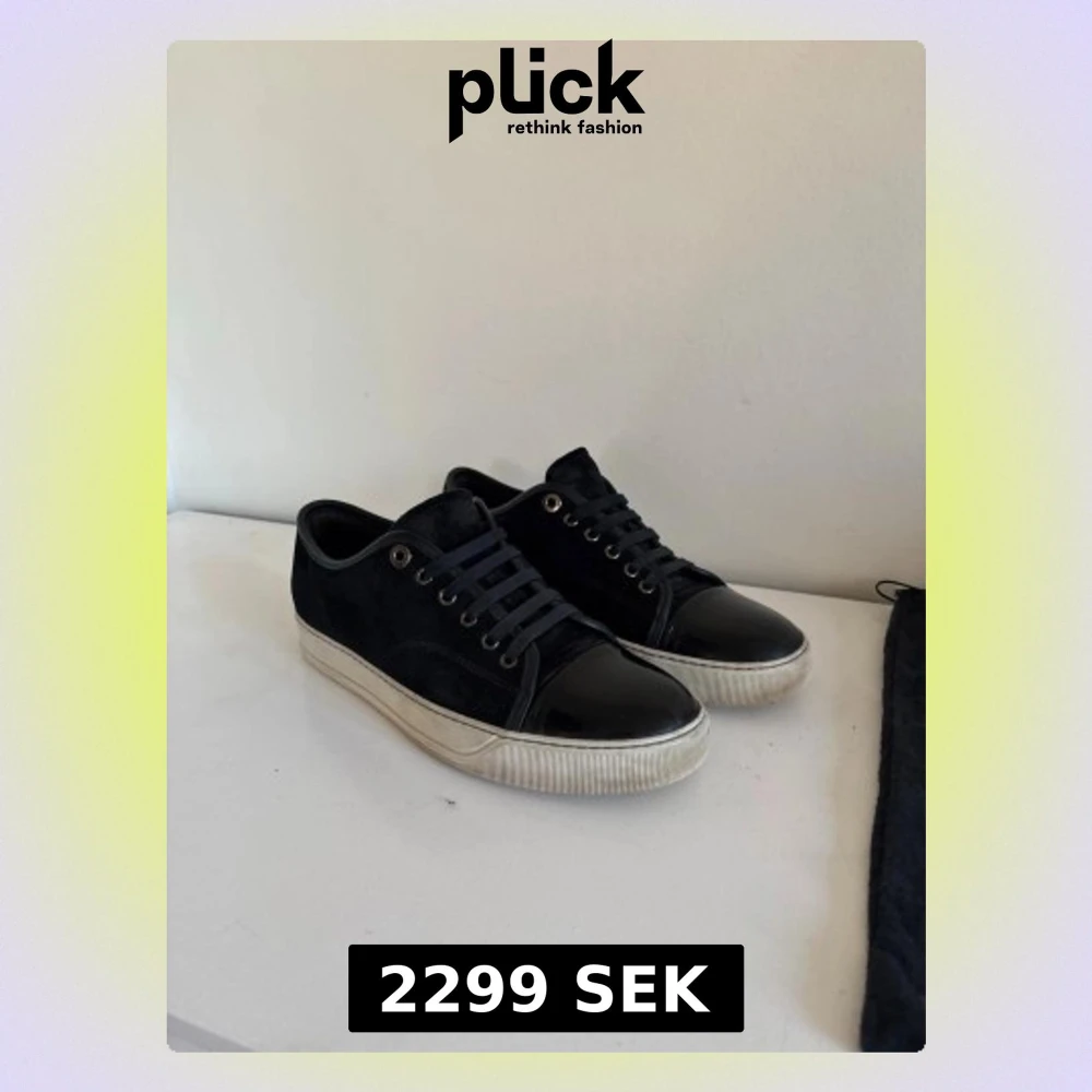 Snygga svarta sneakers från Lanvin med ovandel i mocka och tåparti i blankt lack. Klassisk låg modell med vita sulor och svarta skosnören. Något använda skosulorna enligt bilderna. Perfekta för dig som gillar stilrena och exklusiva sneakers. Dust bag ingår även. Innermåttet är 26,5cm och passar mer 41-42. Seriösa köpare hör av er till mig vid funkeringar!
