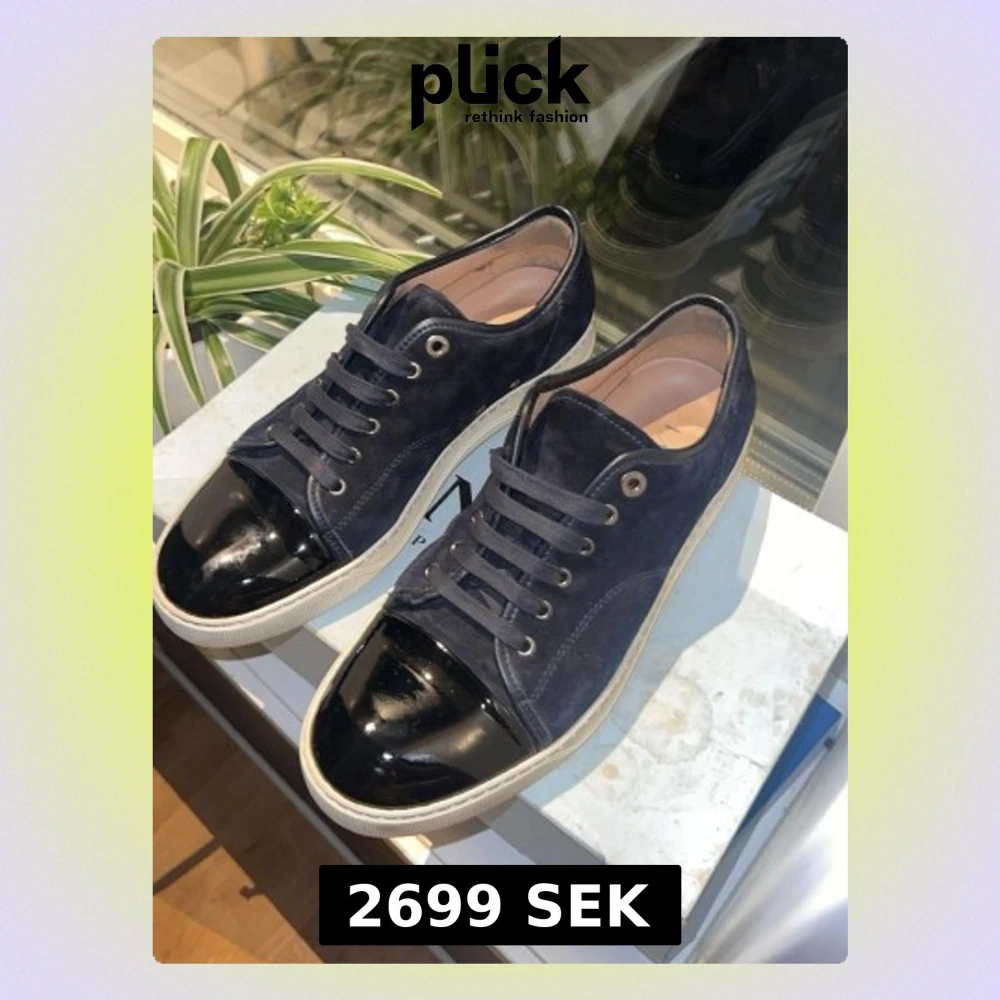Snygga mörkblå sneakers i mocka med svart lackad tå och vita sulor. Skorna har mörkblå snören och metallfärgade öljetter. Perfekta för dig som vill ha en stilren men ändå unik sneaker med cool kontrast mellan mocka och lack. Jätte bra skick, 1 dustbag, extra snören och box ingår