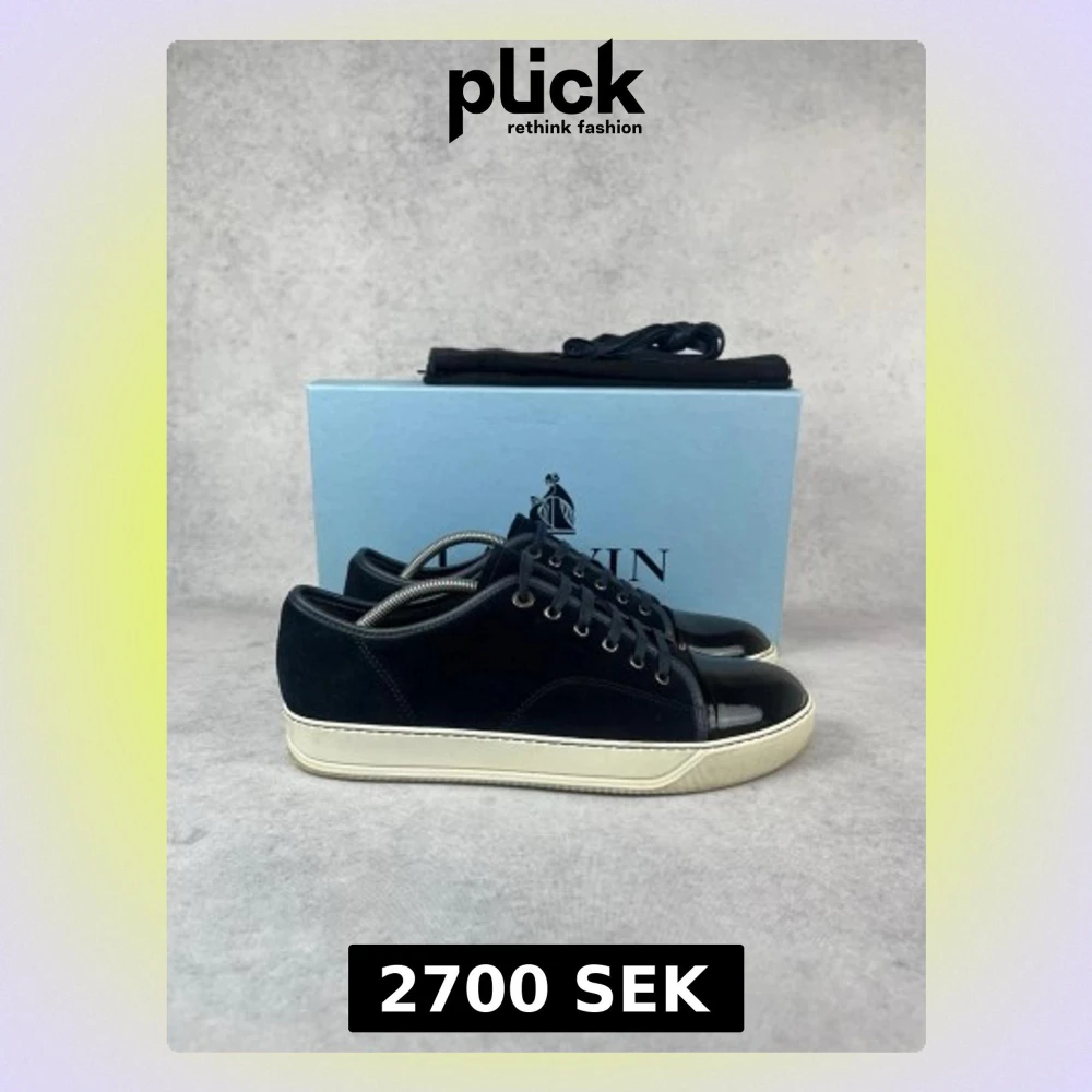 Stilrena svarta sneakers från Lanvin med ovandel i mocka och lackdetaljer på tån. Skorna har vita sulor och svarta skosnören. Perfekta för dig som gillar en clean och lyxig look med exklusiva materialval.