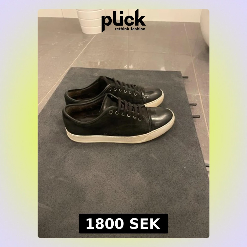 Svarta sneakers med vit sula och snörning. Ovandelen är i mocka och skinn, med blanka detaljer på tån och matta sidor. Klassisk låg modell med rund tå och metallöljetter. Perfekta för en clean och stilren look. (vid frågor är det bara att ställa) storlek är i UK 10. Dem är i väldigt bra skick