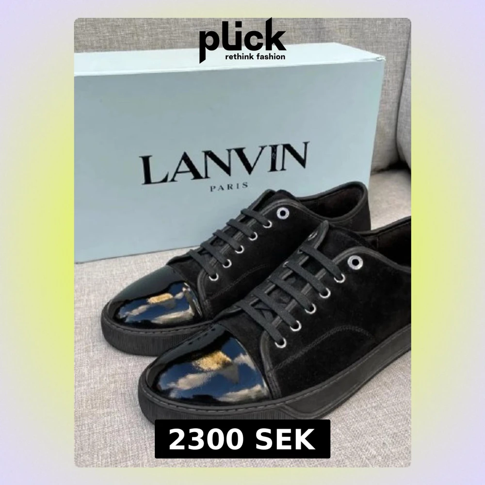 Snygga svarta sneakers från Lanvin med ovandel i mocka och glansig lackad tå. Skorna har svarta skosnören, metallfärgade öljetter och en svart sula. Perfekta för dig som gillar stilrena och exklusiva detaljer. Bara skorna ingår. Nypris 5000kr - mitt pris 2300kr