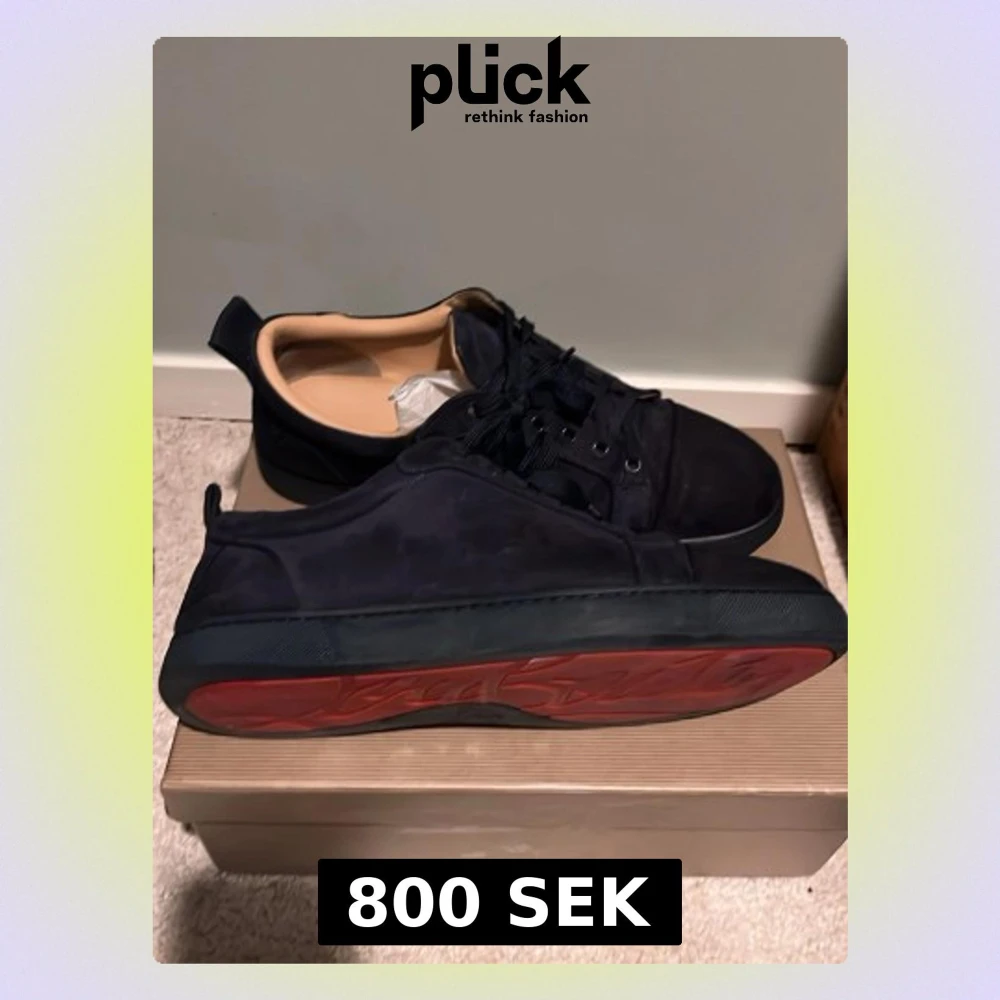 Säljer ett par mörkblå sneakers från Christian Louboutin i storlek 45 med klassisk röd sula. Skorna har en låg profil, svarta skosnören och ovandel i mocka. Insidan är beige och de kommer i originalkartong. Skornas skick är 8-10