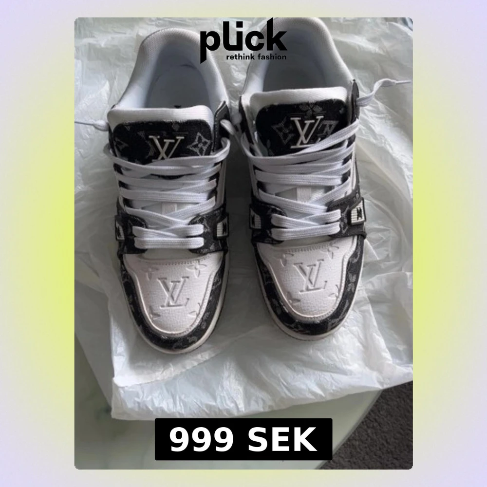 Säljer ett par snygga Louis Vuitton sneakers i vitt och svart med klassiskt LV-monogram. Skorna har vita snören, präglad LV-logga på tån och detaljer i svart läder med monogrammönster. Perfekta för dig som vill sticka ut med exklusiva sneakers.