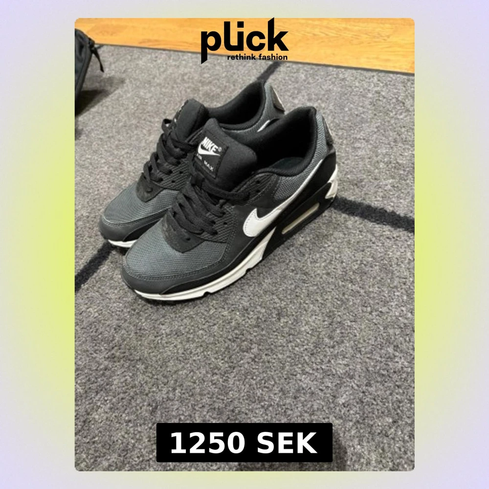 Nike Air Max 90 sneakers i svart och vitt med klassisk synlig Air-sula. Ovandel i mesh och läder för både stil och komfort. Ikonisk vit swoosh på sidan och svart snörning. Perfekta för dig som gillar streetwear och sportig vibe. Köpta för 1700 säljs nu för 1250 eftersom att jag inte använder dem. Dom är iprincip nya bara använda några gånger
