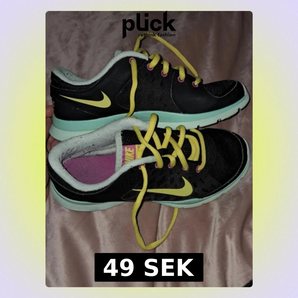 Snygga svarta Nike sneakers med gula skosnören och swoosh-logga. Skorna har mintgröna sulor och lila innersulor med rosa Nike-tryck. Lågt skaft och meshmaterial för extra komfort. Perfekta för dig som vill sticka ut med färgglada detaljer. Storlek 35,5. Även tvättade. De har lite lödder innuti