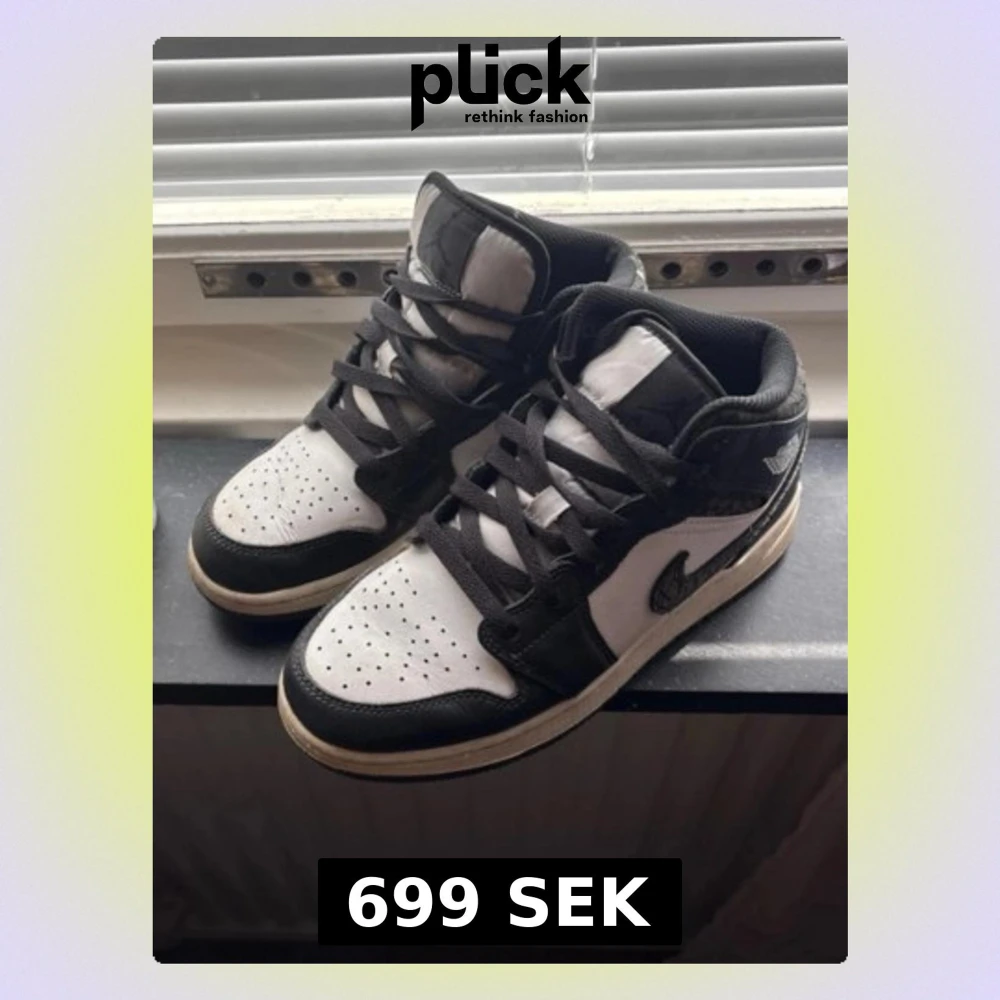 Säljer ett par Air Jordan 1 Mid sneakers i svart och vitt med klassisk Nike swoosh i svart mönstrat material. Skorna har svart snörning, vit tåbox med perforeringar och svart vadderad krage. Perfekta för dig som gillar streetwear och ikonisk design. Köpta för 1500kr, pris kan diskuteras