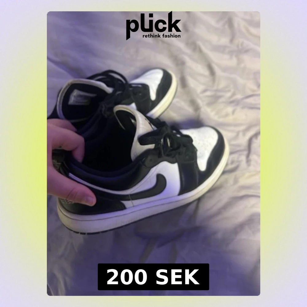 Säljer ett par Air Jordan 1 Low i svart och vitt läder. Klassisk siluett med broderad Air Jordan-logga på hälen och vit sula. Perfekta för dig som gillar streetwear och sneakers med ikonisk design.