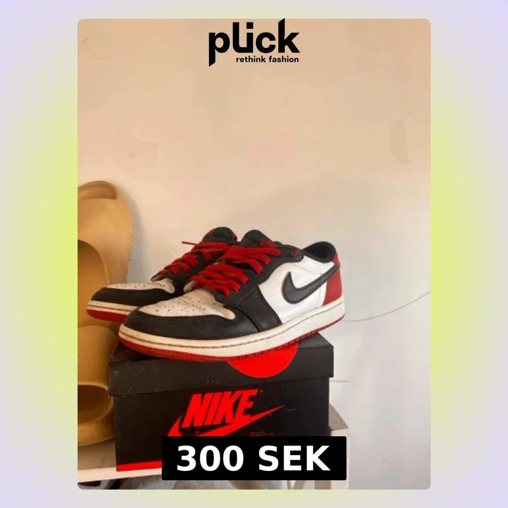 Säljer ett par Nike Air Jordan 1 Low sneakers i svart, rött och vitt läder. Klassisk siluett med röda skosnören, svart swoosh och röd häl. Sitter på originalkartong och har den ikoniska Air Jordan-loggan på hälen. Perfekta för dig som gillar streetwear och retrostil.