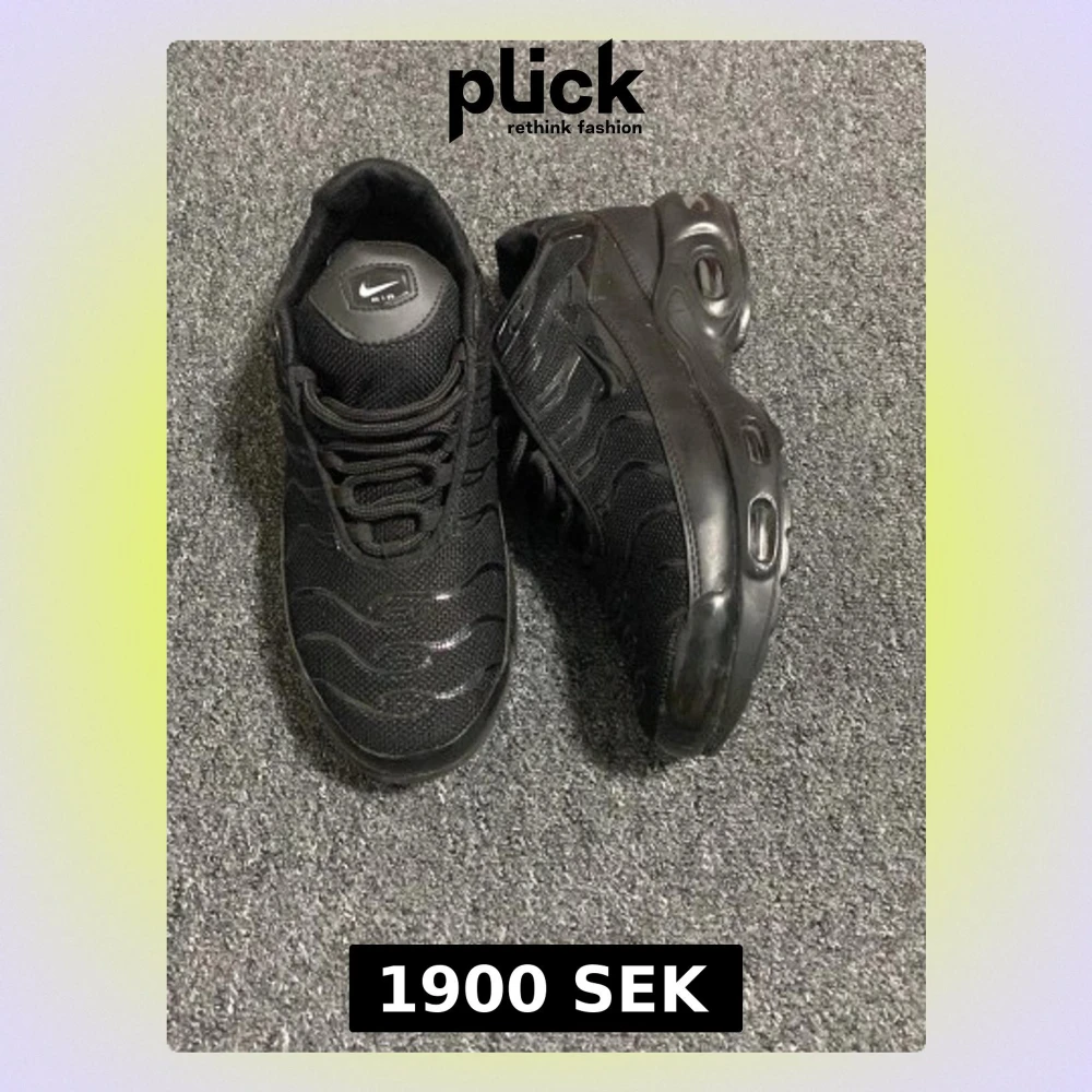 Säljer ett par helsvarta Nike Air Max Plus sneakers med mesh- och syntetmaterial, ikoniska vågiga detaljer och synlig Air-dämpning i sulan. Klassisk Nike-logga på plösen och robust yttersula för extra grepp.