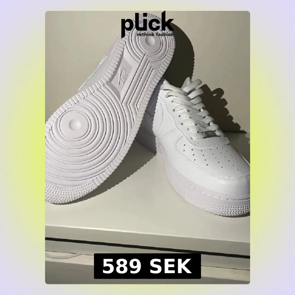 Klassiska Nike Air Force 1 sneakers i helvitt läder med perforerad tåbox, vit sula och vita skosnören. Ikonisk swoosh på sidan och metallbricka med 'AF1' på snörningen. Tidlös och clean design som passar till allt.
