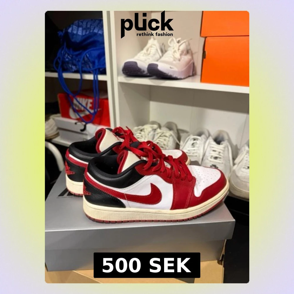 Säljer ett par Air Jordan 1 Low Chicago med klassisk färgkombination i rött, vitt och svart. Skorna har röd Swoosh, röda snören och svart häl med Air Jordan-logga broderad bak. Ovandelen är i läder och sulan är vit med röd yttersula.