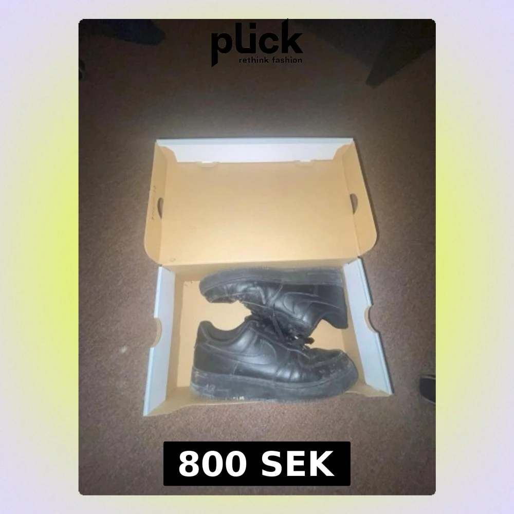 Klassiska helsvarta Nike Air Force 1 sneakers i läder med låg profil och ikonisk swoosh på sidan. Skorna har tjock sula och snörning framtill. Perfekta för dig som gillar streetwear och tidlös stil.