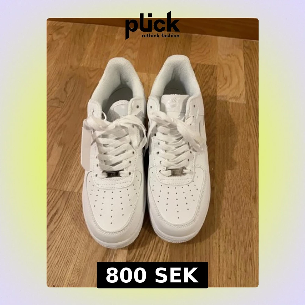 Klassiska helvita Nike Air Force 1 sneakers i lågt utförande. Skorna har ovandel i slätt läder, perforeringar på tån för ventilation och den ikoniska swoosh-loggan på sidan. Tjock vit sula med AIR-detalj och vita skosnören. Perfekta för en clean och stilren look.