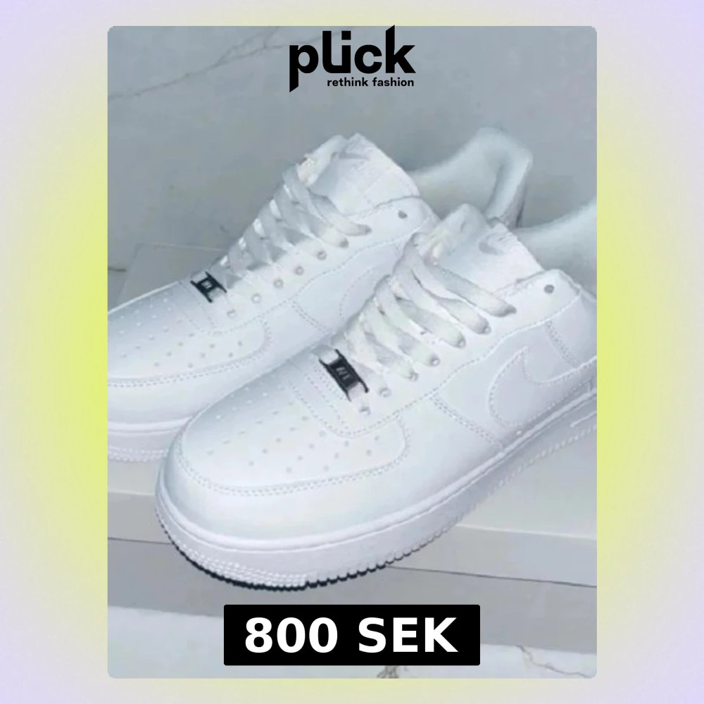Klassiska helvita Nike Air Force 1 sneakers i lågt utförande. Skorna har ovandel i slätt läder, perforeringar på tån för ventilation och den ikoniska swoosh-loggan på sidan. Tjock vit sula med bra grepp och vita skosnören. Perfekta för en clean och stilren look.