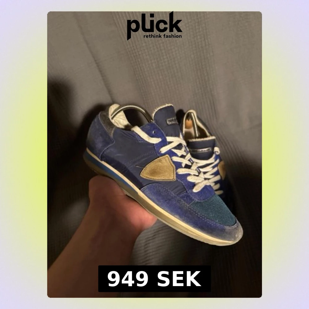 Snygga blå sneakers från Philippe Model med vita skosnören och beige detalj på sidan. Skorna har en mix av mocka och textilmaterial samt en låg siluett. Perfekta för dig som gillar streetwear och vill ha något unikt på fötterna.