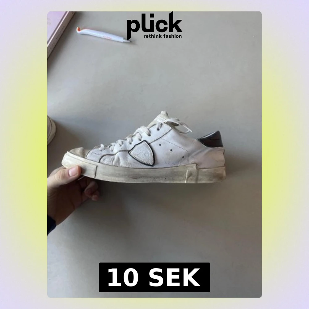 Säljer ett par vita låga sneakers från Philippe Model med svart detalj på hälen och den klassiska sköldloggan på sidan. Skorna har vita snören och en robust sula. Tillverkade i läder med en cool, avslappnad vibe.