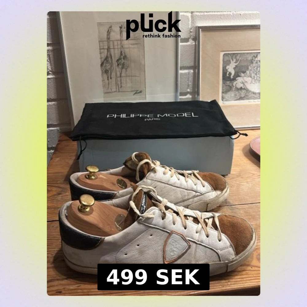 Snygga vita sneakers från Philippe Model med bruna mockadetaljer på tån och svart hälparti. Skorna har klassisk låg profil, vita snören och ikonisk sköldlogga på sidan. Yttersulan är svart med tydlig Philippe Model-text. Perfekta för en trendig streetstil.