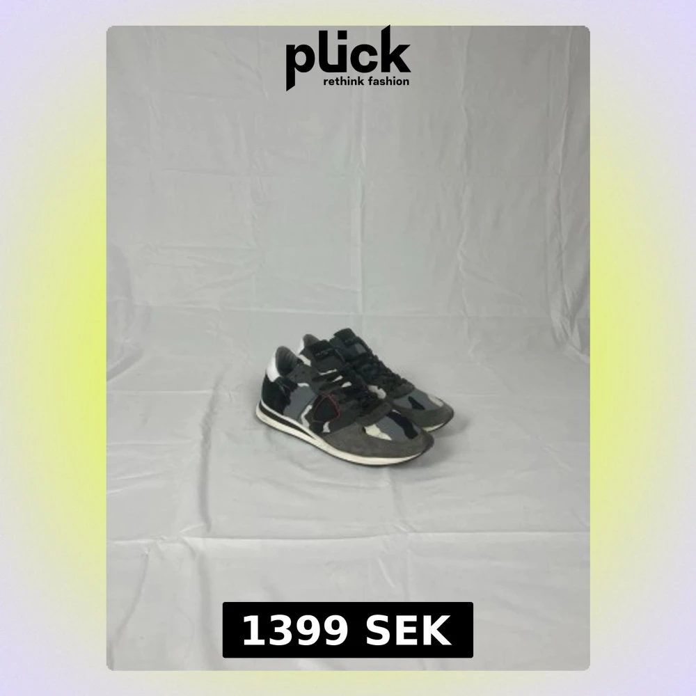 Philippe Model sneakers i en grå camo-färg, skorna är i riktigt bra skick och är i storlek 45, men passar 44. Vid frågor eller funderingar är det bara att höra av sig!