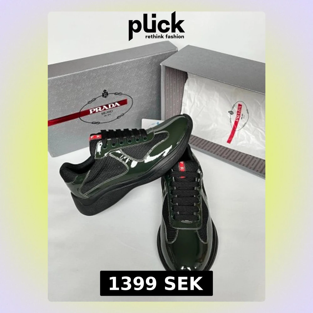 Snygga mörkgröna sneakers från Prada med glansig finish och svarta meshdetaljer. Skorna har svarta snören, svart sula och en röd Prada-logga på plösen. Materialmix av lack och mesh ger en modern och exklusiv känsla.