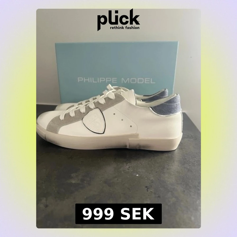 Stilrena vita sneakers från Philippe Model med grå mockadetaljer och blågrå häl. Klassisk låg modell med vita skosnören och logotyp på sidan. Ovandel i skinn och mocka, sula i gummi. Perfekta för en clean och modern look.