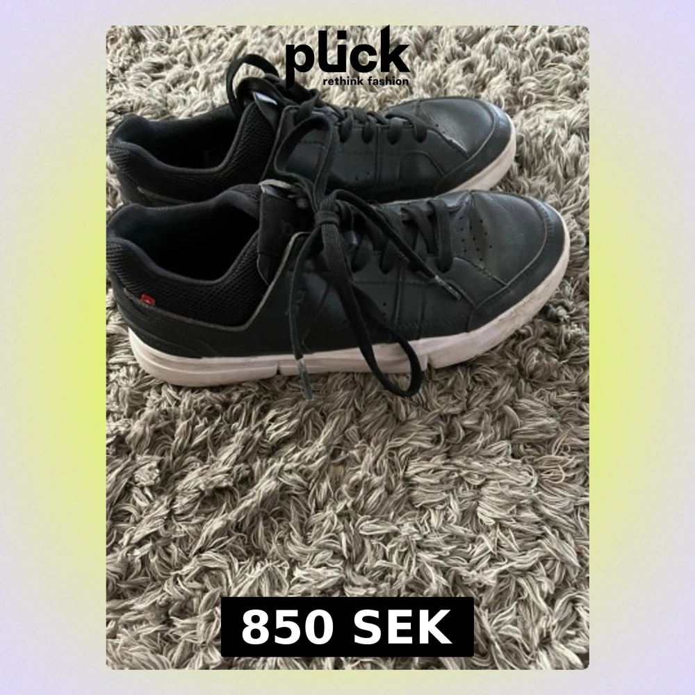 Stilrena svarta sneakers med vit sula och diskret logga på sidan. Skorna har klassisk låg profil, svarta skosnören och ventilerande meshdetaljer vid hälen. Ovandelen är i slätt läder och perforerade detaljer ger extra stilpoäng.