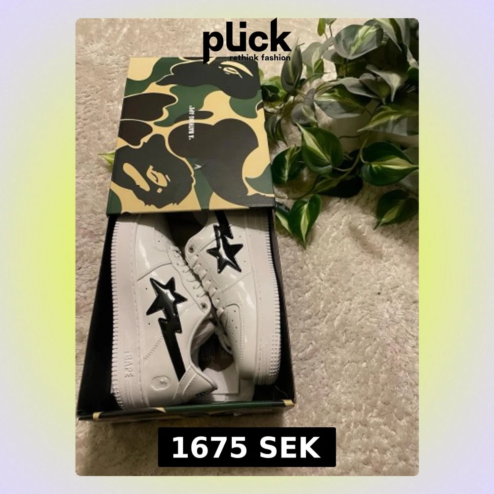 Säljer ett par vita BAPE STA sneakers med svart lackad stjärnlogga på sidan. Skorna har klassisk låg siluett, vita snören och detaljer i blankt läder. Kommer i originalkartong med BAPE:s ikoniska camo-mönster. Perfekta för dig som gillar streetwear och vill sticka ut.