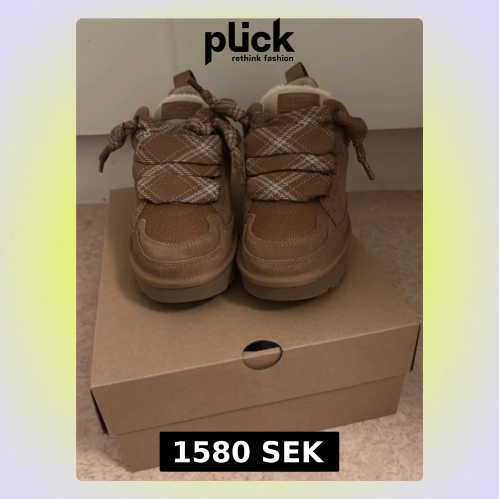 Snygga bruna sneakers från UGG med beige och vita mönstrade skosnören. Ovandelen är i mocka och mesh, och insidan har mjukt ullfoder. Skorna har en chunky sula och låg profil, perfekt för dig som gillar streetwear och vill ha något extra bekvämt.