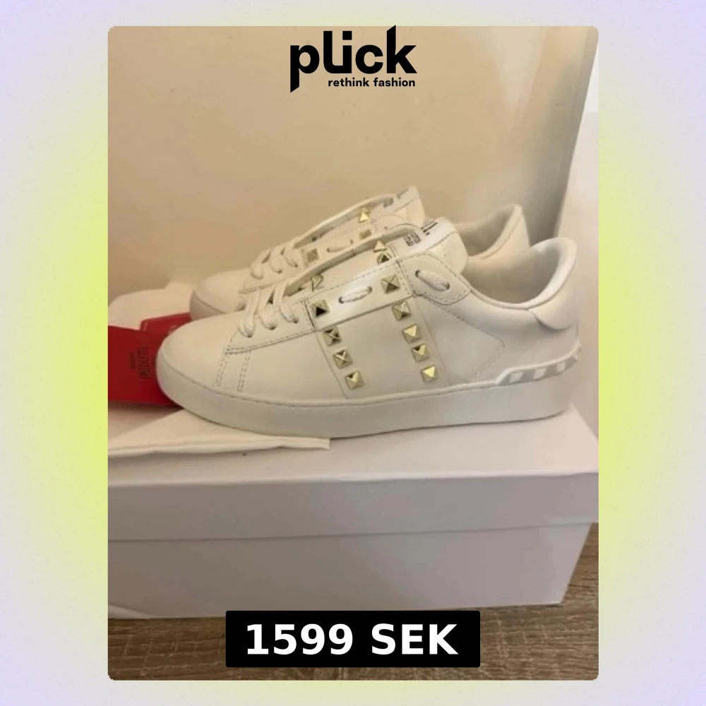 Snygga vita sneakers från Valentino Garavani med coola guldfärgade nitar på sidorna och över vristen. Skorna är i läder och har klassisk låg profil med vita snören och diskret mönster på sulan. Perfekta för dig som vill sticka ut med stil.