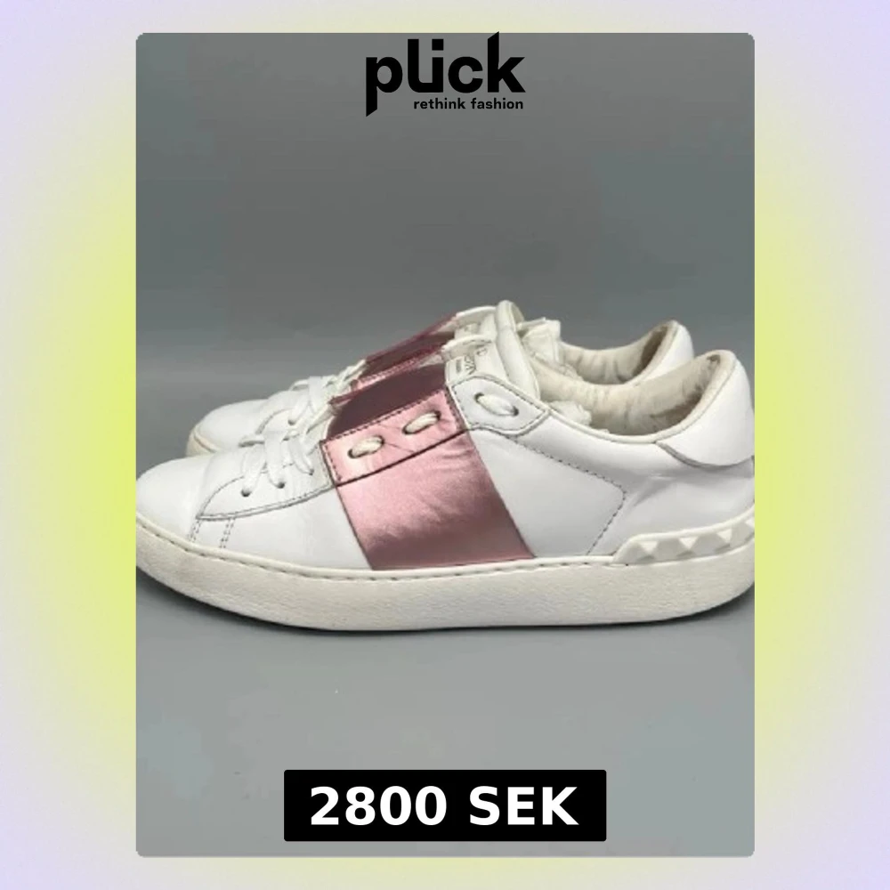 Snygga vita sneakers från Valentino med bred metallicrosa rem över mitten och nitar på hälen, första bilden är inte min men den andra 3 är mina, vill ni ha mer bilder så är de bara å skriva. Köptes för 5500, säljer för 2800 men pris kan diskuteras