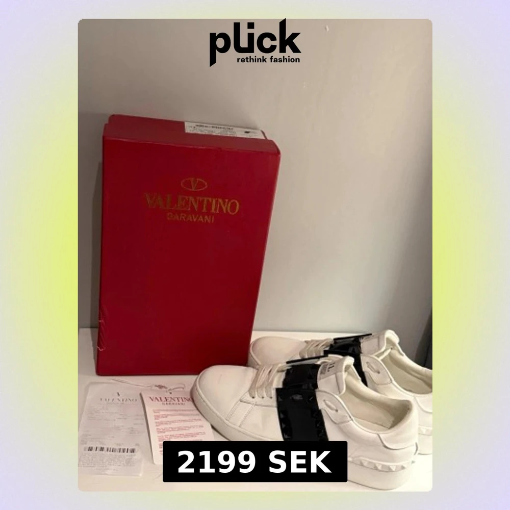 Snygga vita sneakers från Valentino Garavani med svart band och nitar över sidan. Skorna är låga och har en klassisk siluett med coola detaljer. Tillverkade i läder och har märkets logga på plösen. Perfekta för dig som vill sticka ut med stil. Hör av er om ni har några frågor.