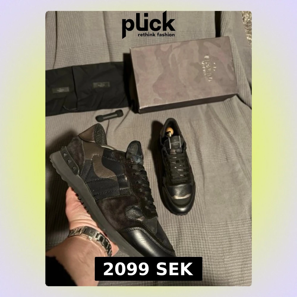 Snygga sneakers från Valentino Garavani i svart och mörkgrå camo. Skorna har en mix av mocka, läder och textil, samt coola nitar på hälen. Tjock sula och klassisk låg modell med svarta skosnören och logga på plösen.