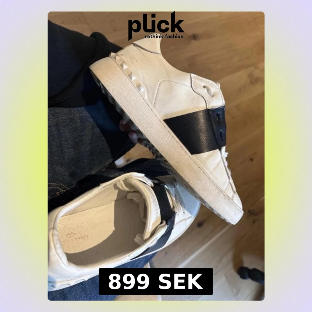 Snygga vita sneakers från Valentino med en bred svart remsa över mitten och coola nitar på hälen. Klassisk låg modell med vita snören och diskret logga på plösen. Perfekta för dig som vill ha en stilren men ändå unik look.