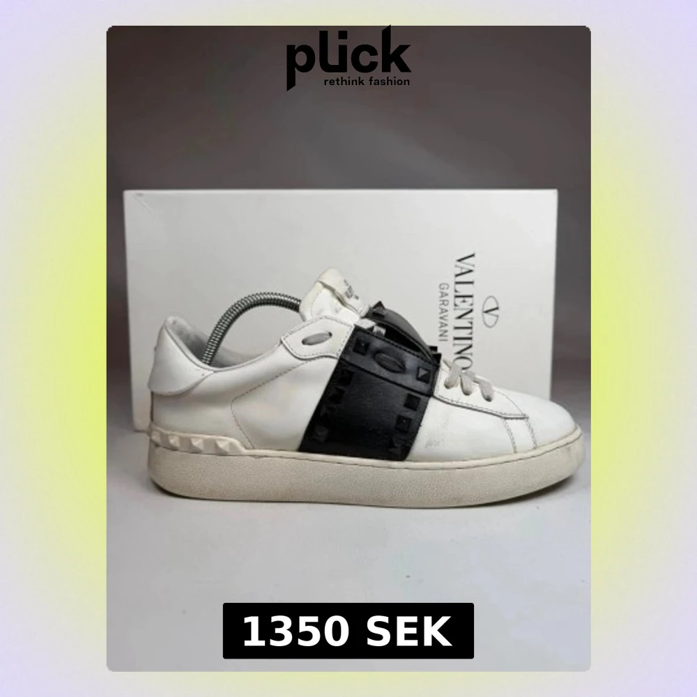Snygga vita sneakers från Valentino Garavani med svart läderdetalj och ikoniska nitar över vristen. Skorna har snörning och en chunky sula med nitar längs hälen. Perfekta för dig som gillar exklusiv streetstyle.