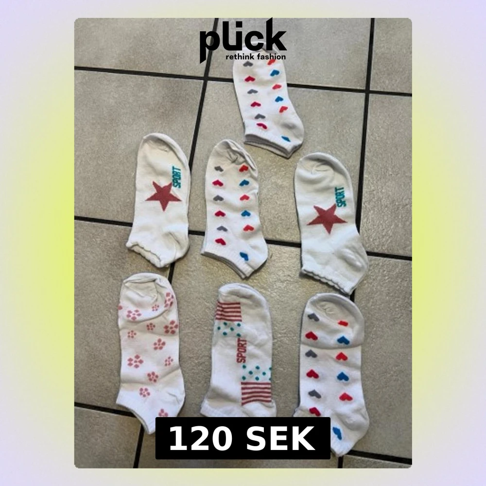 Säljer ett gäng vita låga strumpor med olika mönster som hjärtan, stjärnor, tassavtryck och ränder. Några har texten 'SPORT' i färg. Färgerna på mönstren är röd, blå, grå och rosa. Perfekta till sneakers eller låga skor.
