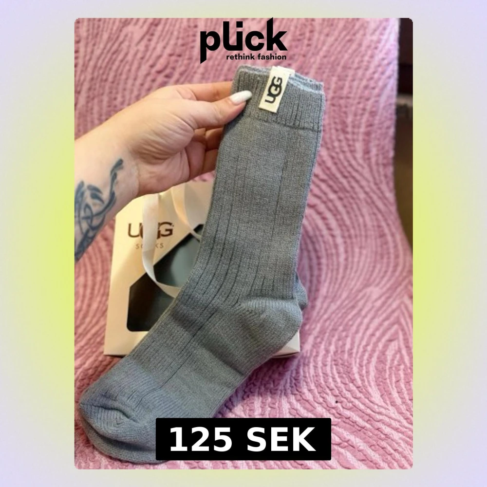 Säljer ett par grå ribbade strumpor från UGG. De är mjuka och har en klassisk, hög modell med UGG-logga på kanten. Perfekta för dig som vill ha både stil och komfort. Kommer i originalförpackning.