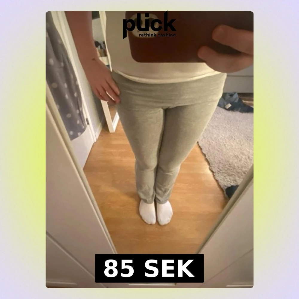 Grå mjukisbyxor med låg midja - Säljer ett par ljusgrå mjukisbyxor med låg midja och utsvängda ben. Byxorna har en bred linning som kan vikas ner för en avslappnad look. Perfekta för chill dagar hemma eller när du vill vara bekväm men ändå se snygg ut. Materialet känns mjukt och stretchigt.