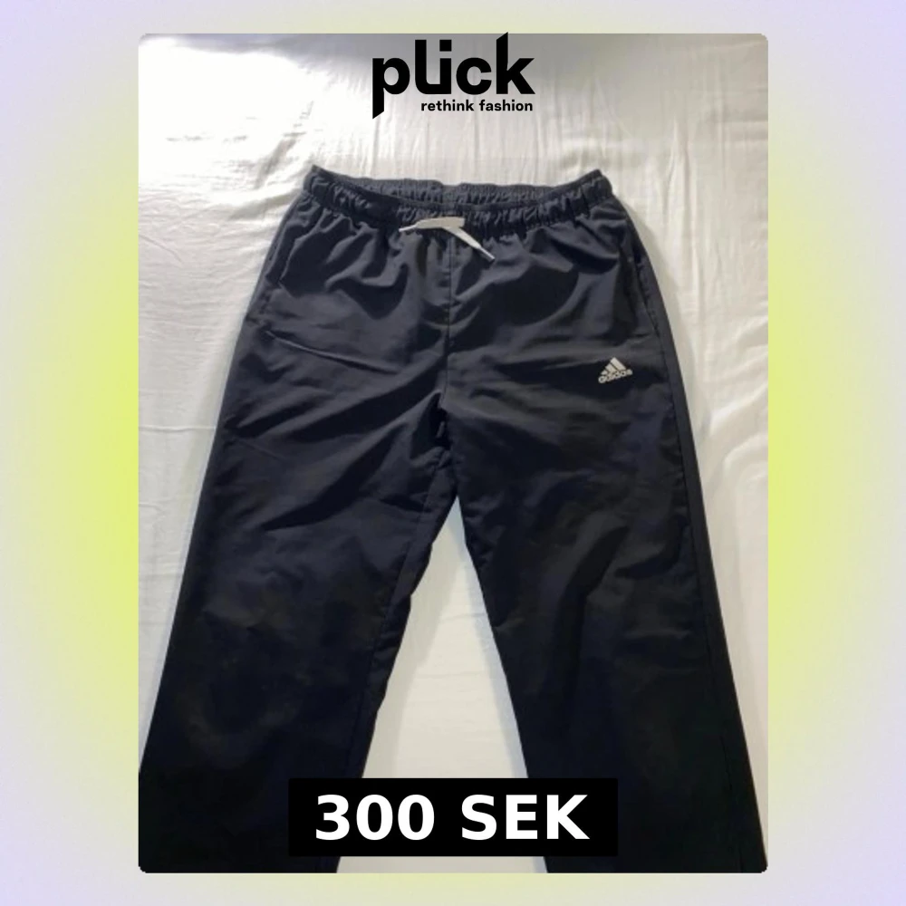 Säljer ett par svarta mjukisbyxor från Adidas med klassisk logga på vänster ben. Byxorna har resår i midjan med vit dragsko och raka ben. Perfekta för chill dagar eller träning. Materialet känns mjukt och bekvämt.