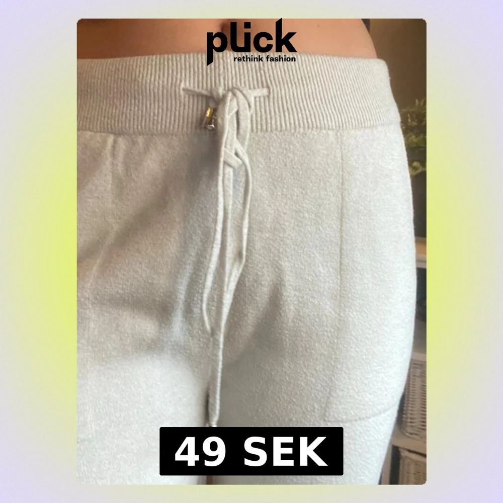 Säljer ett par beige mjukisbyxor med bred resår i midjan och dragsko med gulddetaljer. Byxorna har raka ben och sidofickor. Materialet är mjukt och stickat.