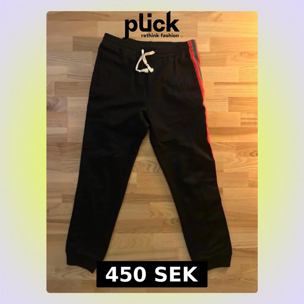 Svarta mjukisbyxor med elastisk midja och vit dragsko. Snygga röda och gröna ränder längs sidorna ger en sportig vibe. Muddar vid benslut och fickor på sidorna. Perfekta för chill eller träning.