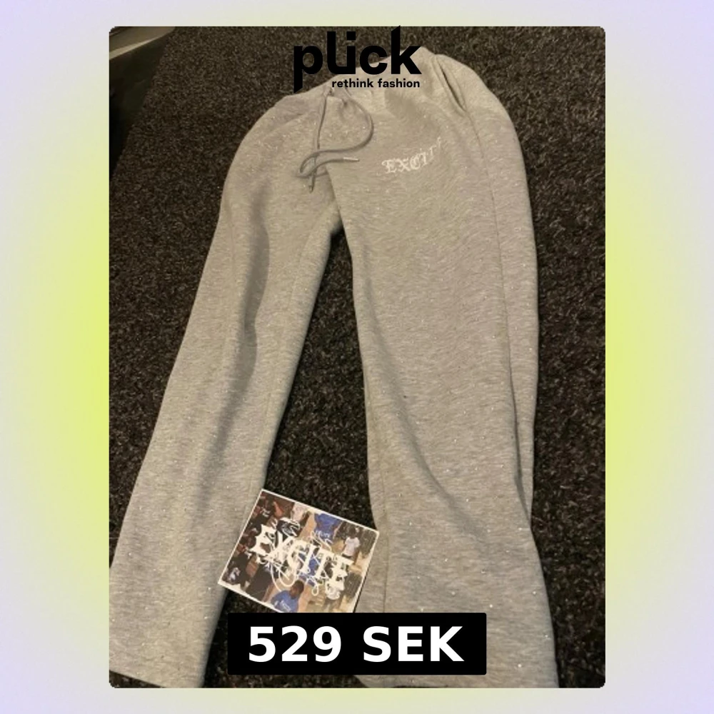 Snygga grå mjukisbyxor från Excite säljs inte längre alls köpte dem sommaren 2024 och inte använt dem skicket är 9/10 storlek s men passar nog M ochså eftersom dem är oversize(: