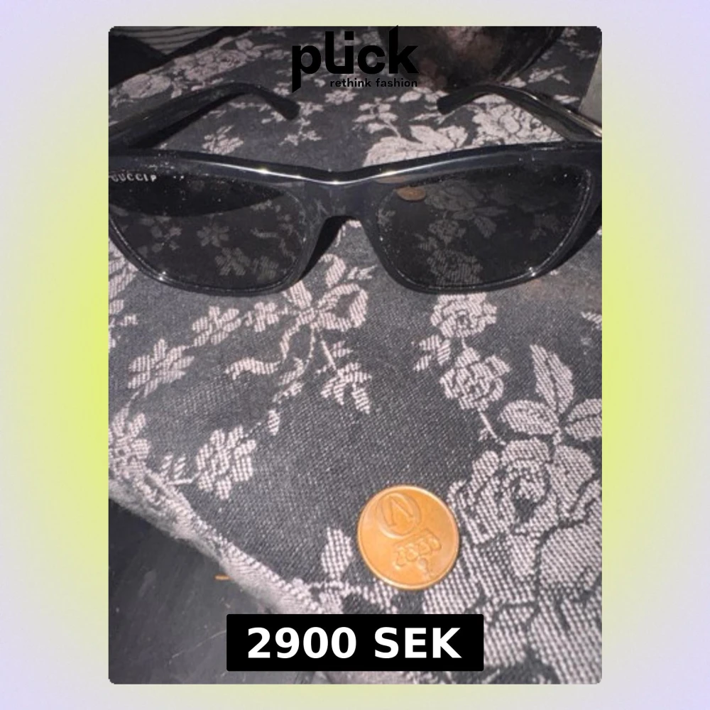 Snygga svarta solglasögon från Gucci med klassisk rektangulär form. Bågarna har Guccis ikoniska röd-gröna rand på sidan och logga i guld. Tillverkade i blankt syntetmaterial som ger en lyxig känsla. ..Äktq vara inga några billiga kopior.