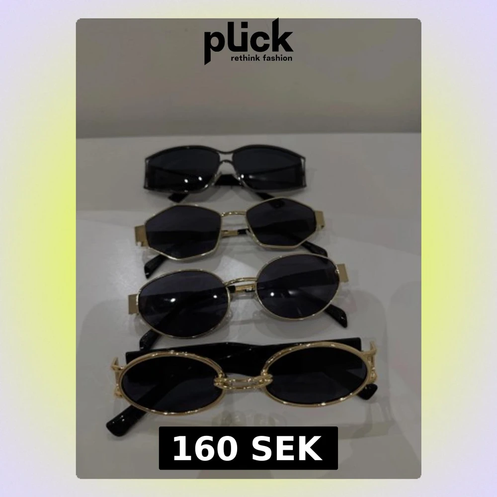 Säljer fyra par solglasögon i olika former. Tre har guldfärgade metallbågar och svarta glas, en har helsvart båge. Bågarna är ovala och runda med coola detaljer. Perfekta accessoarer för att lyfta din stil.
