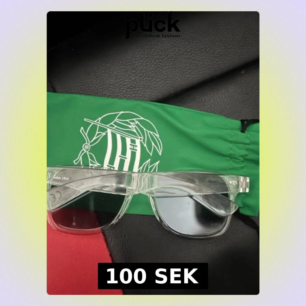 Säljer ett par stilrena solglasögon med transparent båge och spegelglas. Bågarna har en klassisk form och glasen ger en cool, modern look. Perfekta för dig som vill sticka ut med en unik accessoar. Medföljer grön tygpåse med tryck.