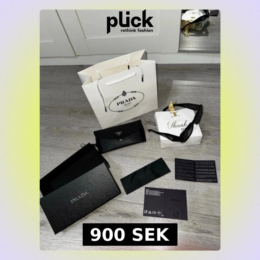 Säljer ett par stilrena svarta solglasögon från Prada med klassisk rektangulär form. Glasögonen har diskret Prada-logga på skalmen och kommer med originalfodral, putsduk, certifikat och förpackning. Perfekta för dig som gillar exklusiv och tidlös design.